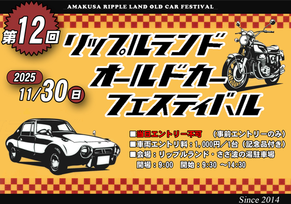 本年(2025年)、第12回目を迎える リップルランドオールドカーフェスティバルは 11月30日(日)に開催致します! 開催要綱を熟読の上、エントリーされる方は 参加申込書を印刷し必須事項をご記入の上 FAXまたは郵送にてお申し込みください。 本ページからエントリーされる方は 本ページ下部の参加申し込みフォームに 必須事項を入力の上、送信してください。 |